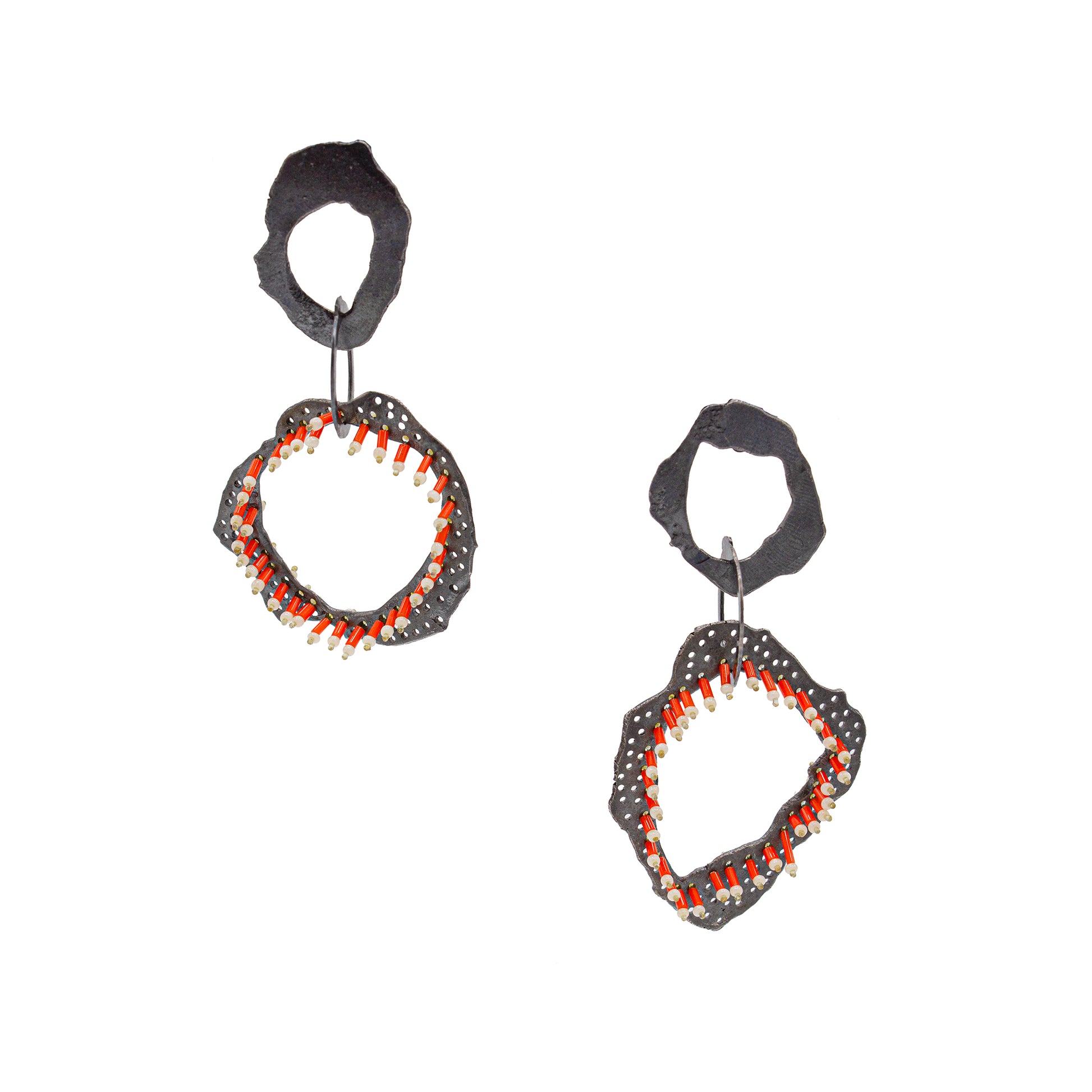 Make a colorful statement with these statement dangle earrings—handmade with hammered silver, stained with a patina base, using orange and pearl beads that are securely attached with monofilament. Add a touch of elegance and uniqueness to your look with these details to your wardrobe!