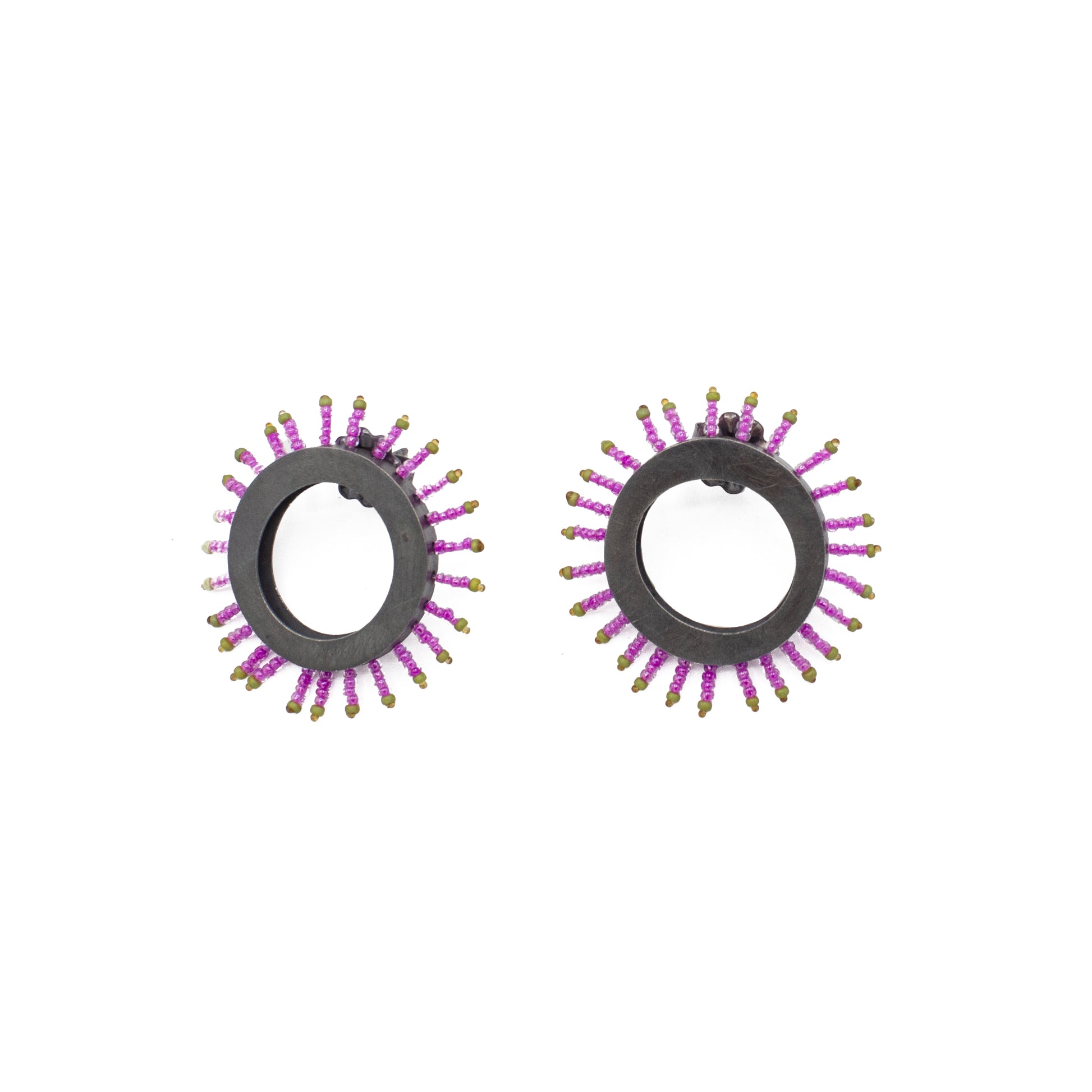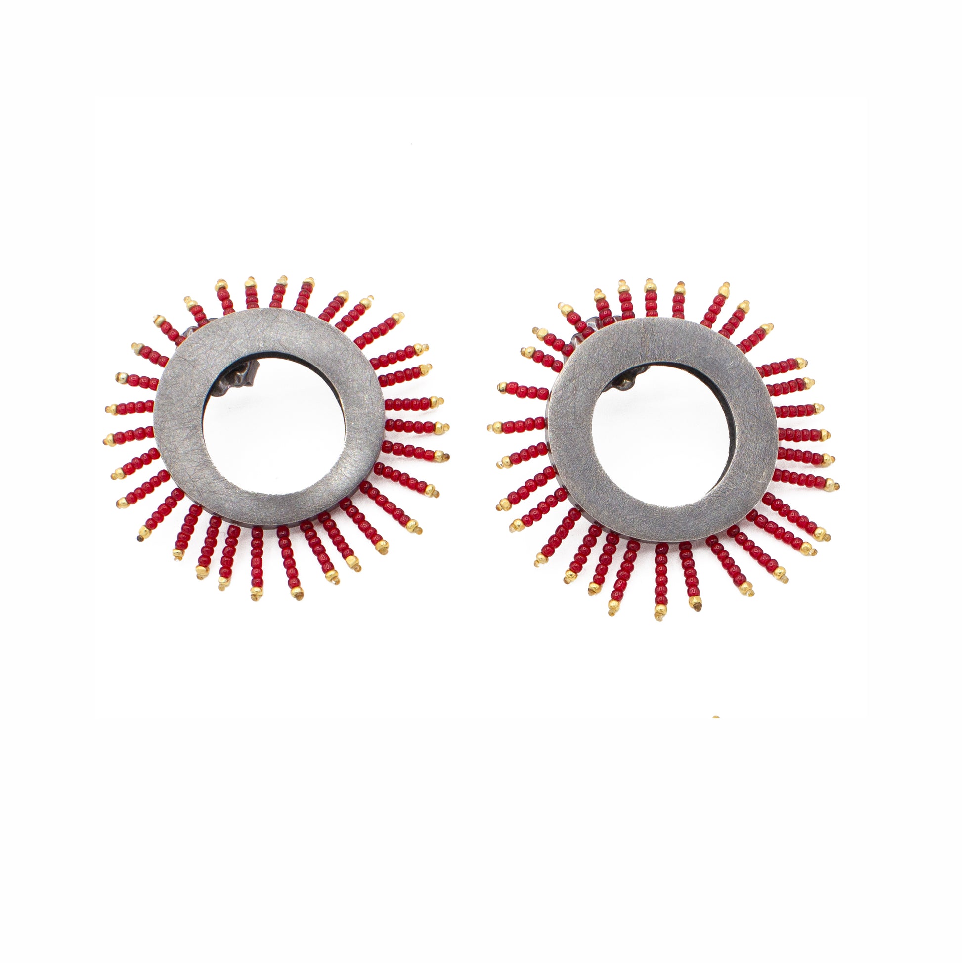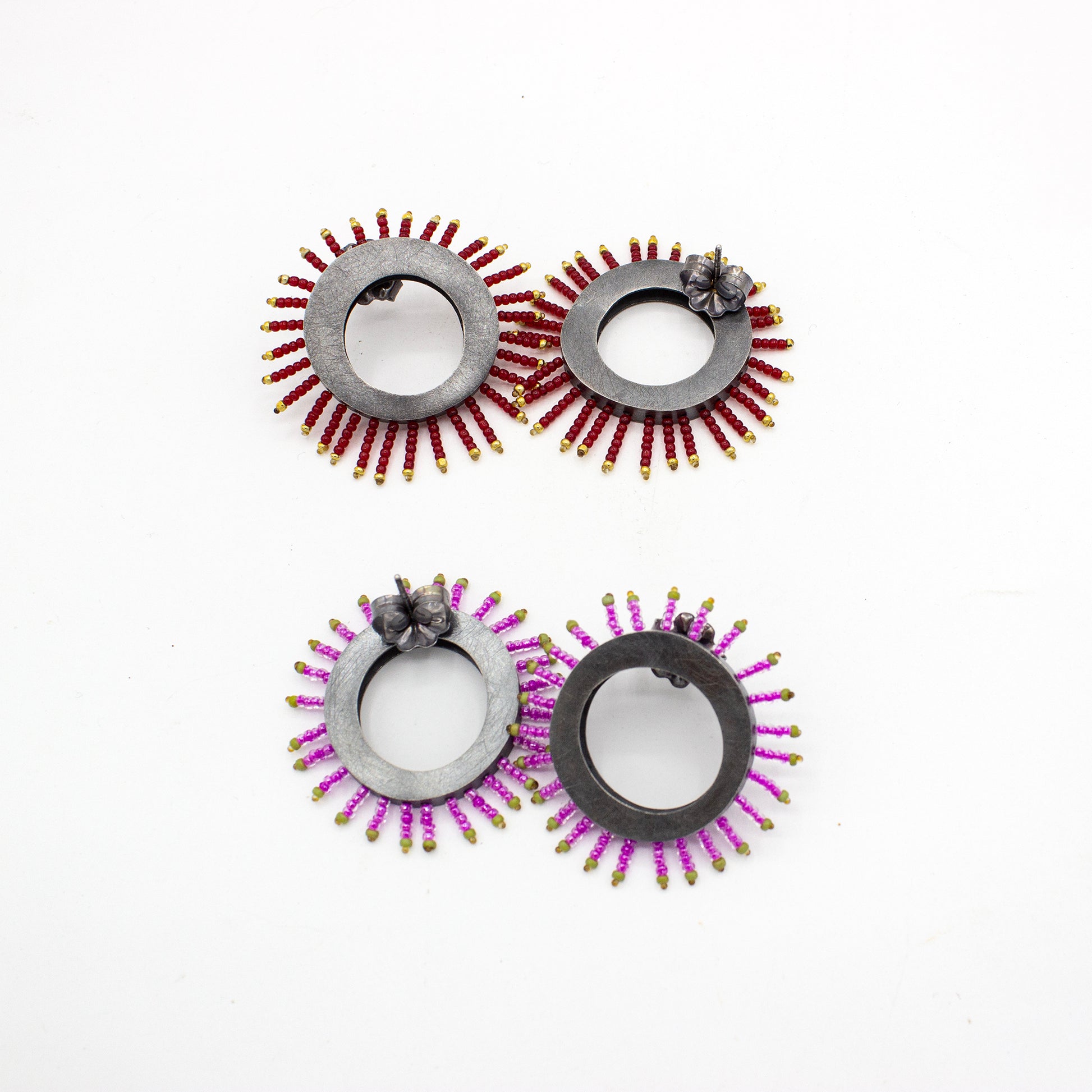 This silver pair of earrings is handcrafted with red or purple beads, monofilament. These earrings are fun, lightweight, and colorful. They will be the perfect addition for a pop of color to your everyday wear.